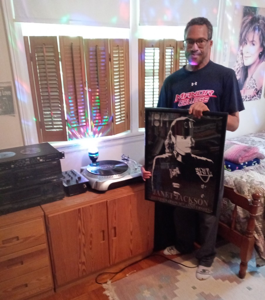 Picture: Myself With Janet Jackson’s “Rhythm Nation 1814” poster with LP on the turntable. A record that inspired me to finishing my college education. A fan of Janet Jackson’s “Rhythm Nation 1814.”